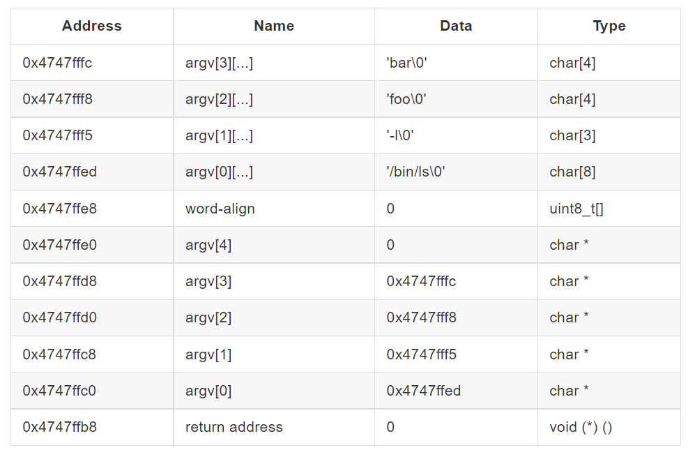 - 'bin/ls -l foo bar'이 커맨드라인에 들어오면 argv[0] = 'bin/ls\0', 'argv[1] = -l\0', argv[2] = 'foo\0', argv[3] = 'bar\0'으로 parsing(문자열 분리)한 뒤에 아래와 같이 스택에 넣어준다.