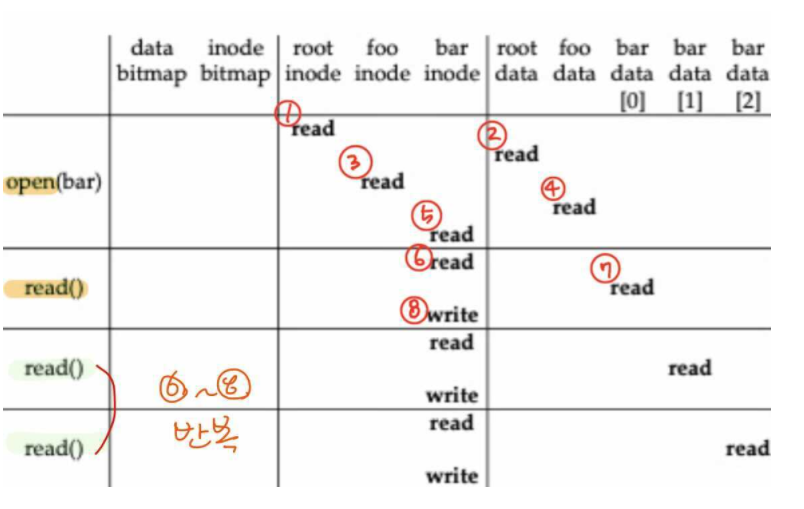 - "bar" 파일을 open했으므로 읽기 수행 가능: "bar"의 아이노드를 읽어 "bar" 데이터 블록으로 이동