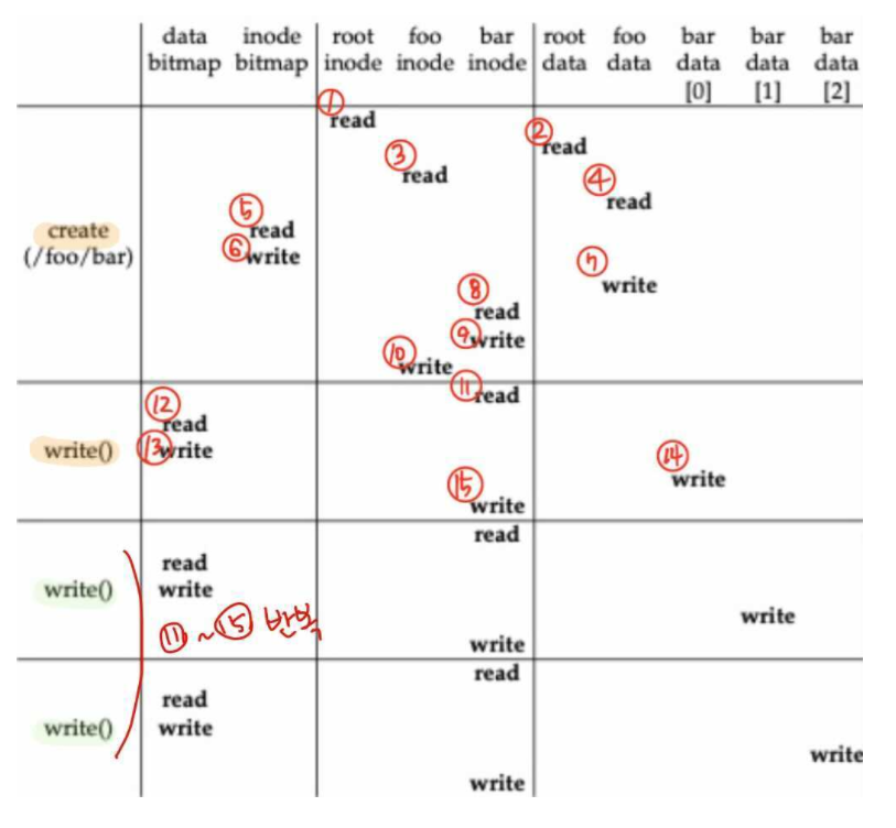 - bar 아이노드를 읽고 새로운 데이터를 위한 디스크 블록을 할당하기 위해 데이터 비트맵으로 이동